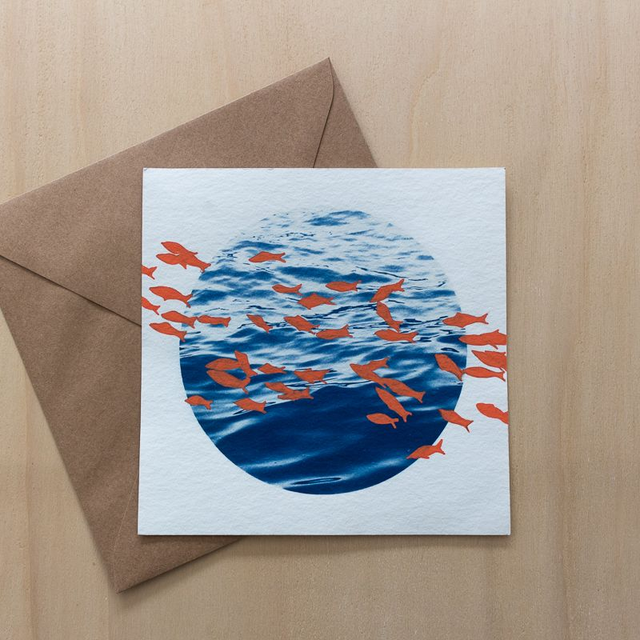 Cyanotype original sur papier aquarelle 300 gr, 14 x 14 cm, avec dessins au feutre.